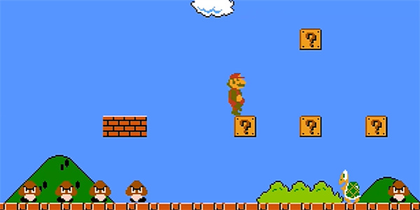 上面有“问号的墙壁”,马里奥撞一下就能获得隐藏道具,不过有时也会被牛吞噬掉。