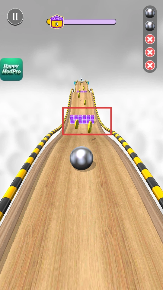 操控金属球穿过紫色方块区域,收集赛道上的金币,朝着关卡目标前进。