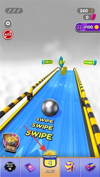 1、点击底部【LEVEL-4】旁边的【PLAY】按钮进入关卡,按照【SWIPE】的提示滑动来控制【球体】移动。