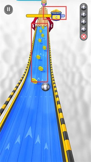 2、在【LEVEL-4】赛道里,控制【球体】拾取【金币】,积累【BONUS-LEVEL】的进度。