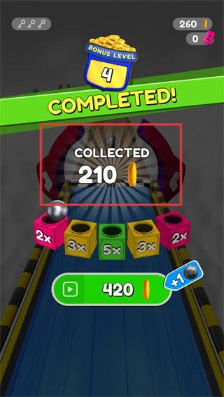 3、关卡完成后会出现【COMPLETED!】的提示,同时显示【COLLECTED-210】金币,玩家可据此获得对应倍数的奖励。