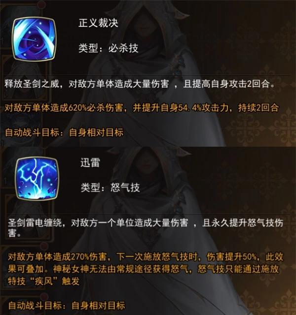 必杀技-正义裁决:对敌方单个目标造成600%的必杀伤害,同时使自身攻击力提高46.7%,效果持续两个回合。