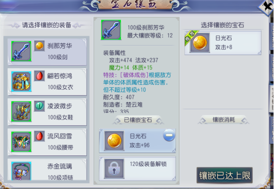 装备能够镶嵌宝石,以此增添不同的装备属性,每件装备镶嵌宝石的上限为两颗,且需为不同类型。