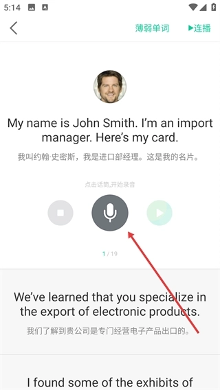 4、进入学习环节后,能够查看语句的中英对照内容,点击【话筒】按钮可以开展录音练习,增强口语表达能力。