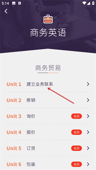 2、进入课程单元列表后,挑选想要学习的目标单元(例如【Unit1-建立业务联系】),点击该单元的条目就能进入对应的学习内容页面。