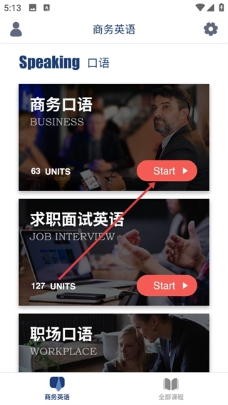 1、进入【商务英语】页面后,挑选你想要学习的口语课程(例如【商务口语】),然后点击该课程对应的【Start】按钮,就能进入到该课程的单元列表页面了。