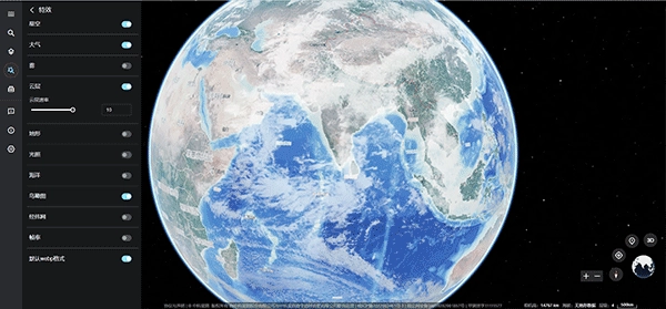 星图地球具备丰富的地球环境特效调节功能,涵盖星空、大气、雾效、光照、帧率、海洋、云层、云层移动速率、地形以及夸张类型等多种参数设置,能够帮助用户构建出直观且高度逼真的三维可视化场景。