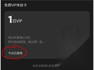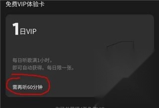 3、点击VIP标志进入VIP界面后,能看到免费VIP体验卡的获取途径,具体是每日使用MOO音乐听歌时长达到1小时。