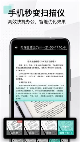 多种图像处理模式,可手动调节图像参数,用手机即可将纸质文件,快速转为清晰的电子稿。