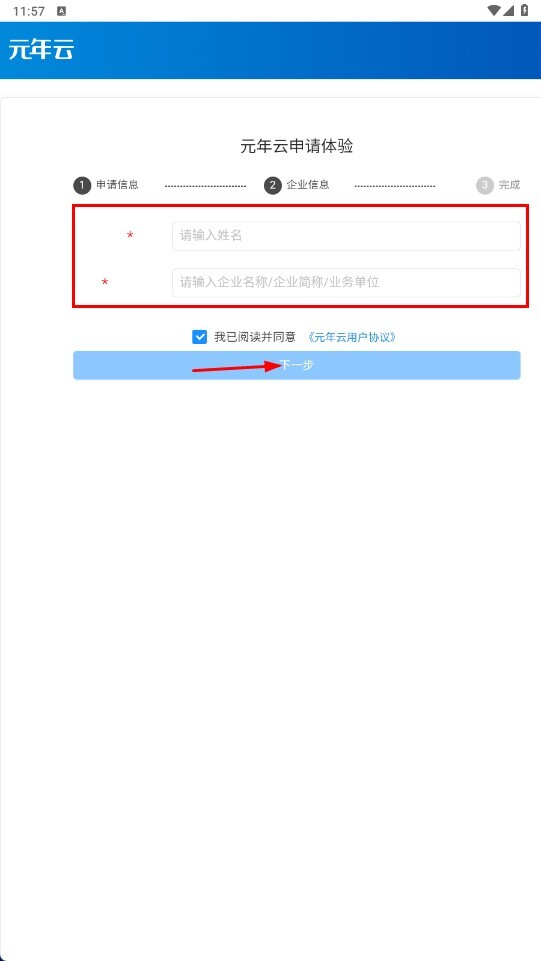 进入企业信息页面后,依次填写姓名、企业名称等相关信息,接着点击【下一步-功能按钮】即可。