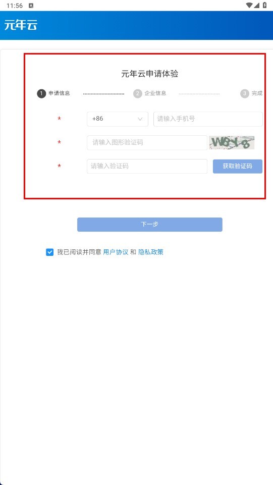 在申请体验的页面中,依次填写手机号码、图形验证码以及短信验证码,随后点击【下一步】功能按钮。