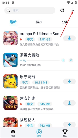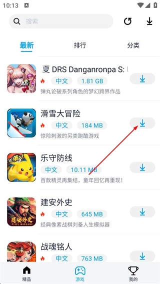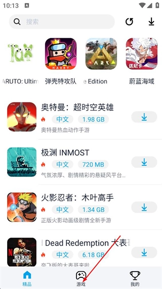 1、在淘气侠首页,点击底部的游戏选项,进入游戏资源页面。